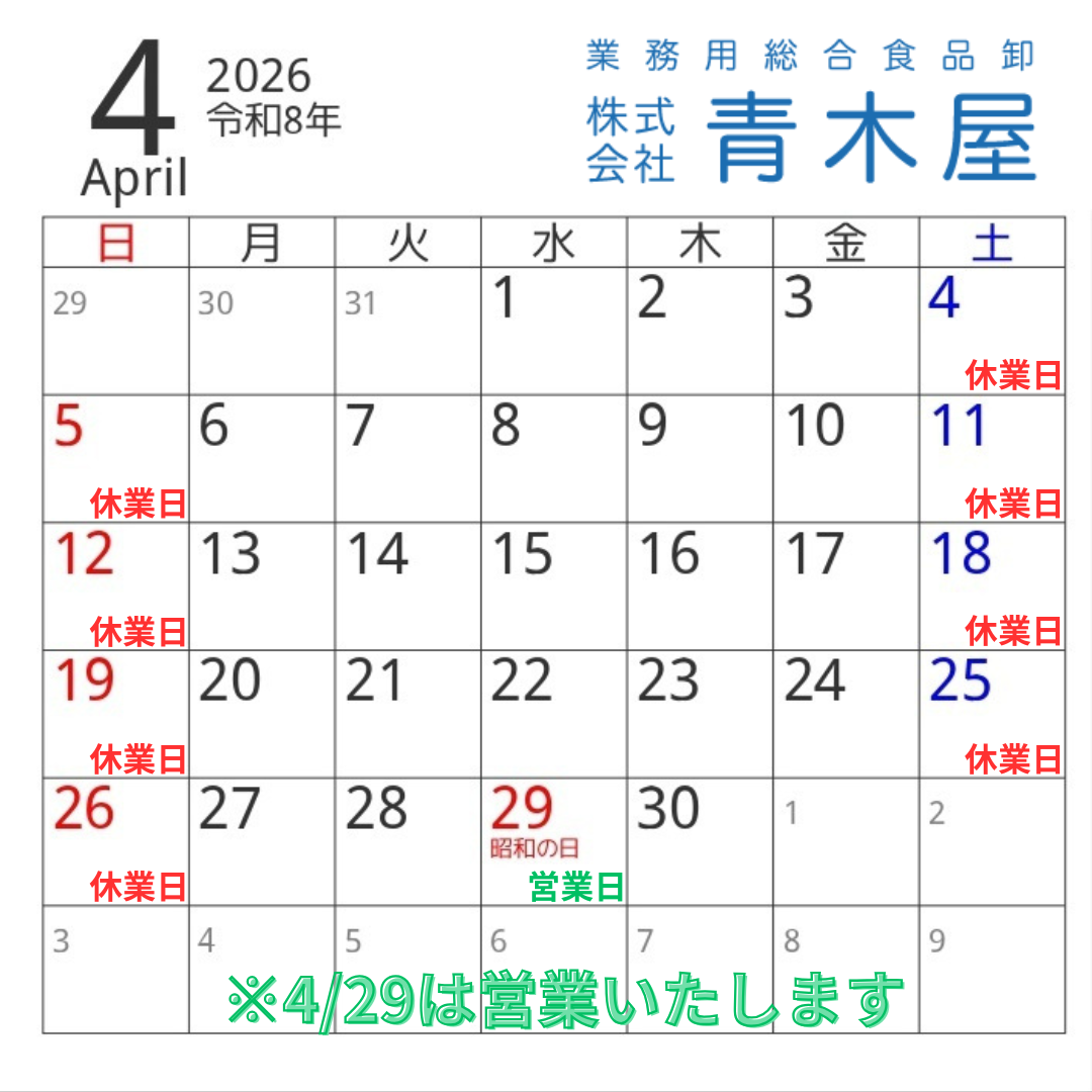 4月休業日のお知らせ 2026.03.01 HOME ニュース 4月休業日のお知らせ 4月休業日のお知らせです。 営業時間 : 8:30~17:30 ※お取り寄せ商品のご注文は、お早めにご連絡いただけますと幸いです。 弊社営業カレンダーは、こちらからダウンロードできます。 本社 成田支店 山梨支店 Tweet 3月休業日のお知らせ 最新記事 2026.03.01 4月休業日のお知らせ 2026.02.01 3月休業日のお知らせ 2026.01.10 当社代表者を装った不審なメールに関する注意喚起 2025.01.27 山梨支店 移転のお知らせ 2023.03.01 求人情報を掲載しました 2022.08.23 本社移転のお知らせ 2018.11.30 総合食品卸の株式会社青木屋ホームページを公開いたしました