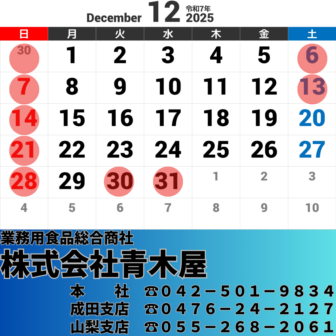 12月休業日のお知らせ 2025.11.01 HOME ニュース 12月休業日のお知らせ 12月休業日のお知らせです。 営業時間 : 8:30~17:30 ※お取り寄せ商品のご注文は、お早めにご連絡いただけますと幸いです。 弊社営業カレンダーは、こちらからダウンロードできます。 本社 成田支店 山梨支店 Tweet 山梨支店 移転のお知らせ 年末年始休業のお知らせ 最新記事 2025.11.05 年末年始休業のお知らせ 2025.11.01 12月休業日のお知らせ 2025.01.27 山梨支店 移転のお知らせ 2023.03.01 求人情報を掲載しました 2022.08.23 本社移転のお知らせ 2018.11.30 総合食品卸の株式会社青木屋ホームページを公開いたしました