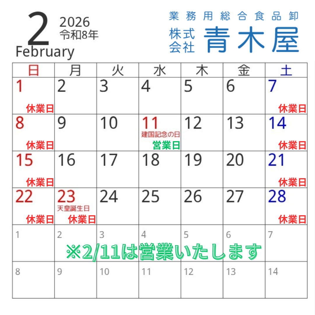 2月休業日のお知らせ 2026.01.02 HOME ニュース 2月休業日のお知らせ 2月休業日のお知らせです。 営業時間 : 8:30~17:30 ※お取り寄せ商品のご注文は、お早めにご連絡いただけますと幸いです。 弊社営業カレンダーは、こちらからダウンロードできます。 本社 成田支店 山梨支店 Tweet 新年のご挨拶 最新記事 2026.01.02 2月休業日のお知らせ 2026.01.01 新年のご挨拶 2025.12.01 1月休業日のお知らせ 2025.01.27 山梨支店 移転のお知らせ 2023.03.01 求人情報を掲載しました 2022.08.23 本社移転のお知らせ 2018.11.30 総合食品卸の株式会社青木屋ホームページを公開いたしました