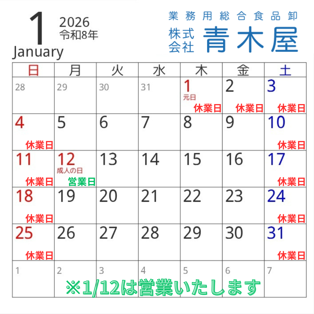 1月休業日のお知らせ 2025.12.01 HOME ニュース 1月休業日のお知らせ 1月休業日のお知らせです。 営業時間 : 8:30~17:30 ※お取り寄せ商品のご注文は、お早めにご連絡いただけますと幸いです。 弊社営業カレンダーは、こちらからダウンロードできます。 本社 成田支店 山梨支店 Tweet 年末年始休業のお知らせ 最新記事 2025.12.01 1月休業日のお知らせ 2025.11.05 年末年始休業のお知らせ 2025.11.01 12月休業日のお知らせ 2025.01.27 山梨支店 移転のお知らせ 2023.03.01 求人情報を掲載しました 2022.08.23 本社移転のお知らせ 2018.11.30 総合食品卸の株式会社青木屋ホームページを公開いたしました